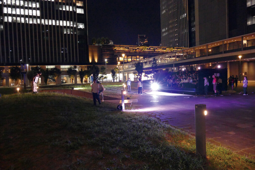 ささしまスタジオ主催「オイスターズがささしまライブの公園でつくる野外劇」は果敢な作品だった。作・演出の平塚直隆たちが立ち向かったのはビルや道路に囲まれた街なか。周辺は人の往来が可能で、野外劇というより市街劇の様相だった。使用条件の都合で音響はなく、俳優は地声で会話を繰り広げ、歌でも盛り上げる。360度回転式の客席も人力で動かしており、ギリシャ劇に通じるような演劇の原点が随所に見られた。題材の「ドラゴンクエスト」も親しみやすく、企画全体が演劇と地域、双方の活性化に新たな方法を示した。