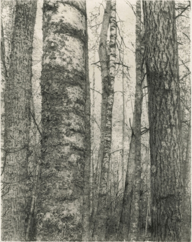 これまで山田は名画を再現した立体を撮影し、インタリオ技法で大画面に転写するシリーズを展開してきた。しかし海外研修を契機に、今までとは打って変わった正統派の銅版画を発表する。AIN SOPH DISPATCHのグループ展「I want to see the other side of the scenery you saw」で公開した新作は、過去の大作に比べるとずっと小さく、一日に数センチ四方ずつ彫り進めていくのだという。描かれるのは雪のユヴァスキュラの森である。さきにこの技法ではまくれが肉眼でほとんど見えないと述べた。だが掌におさまる小さな画面のなかの、降り積もった雪の表面が冷たい微風にふるえるさまや、白樺の表皮のゆらめきは、たしかに眼に触れている。見るのではなく眼で触れるというのが正しい極小の毛羽立ちに、自然物の精巧さに接したときに似た胸のふるえをおぼえた。